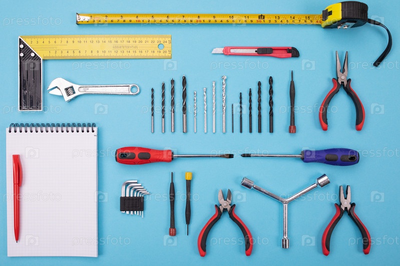 Набор инструментов для металлообработки с блокнотом и ручкой на красочном фоне