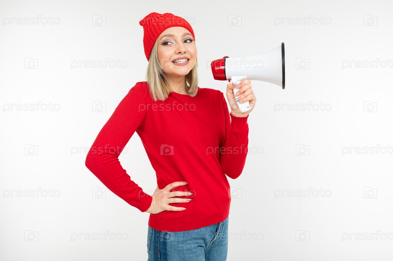Европейская девушка в красной одежде с громкоговорителем в руках кричит на белом фоне