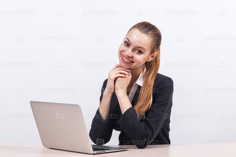 Привлекательная молодая кавказская деловая женщина с хвостиком в черном костюме сидит за офисным столом и работает с ноутбуком, полагается на руки, улыбается изолированно на сером