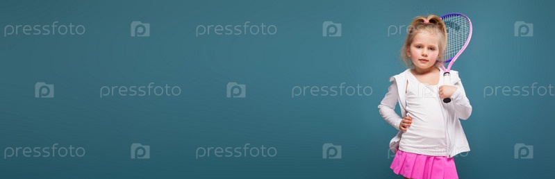 Широкоэкранное изображение, изолированное на голубом, красивая милая кавказская блондинка в белой рубашке, белой куртке и розовой юбке с теннисной ракеткой