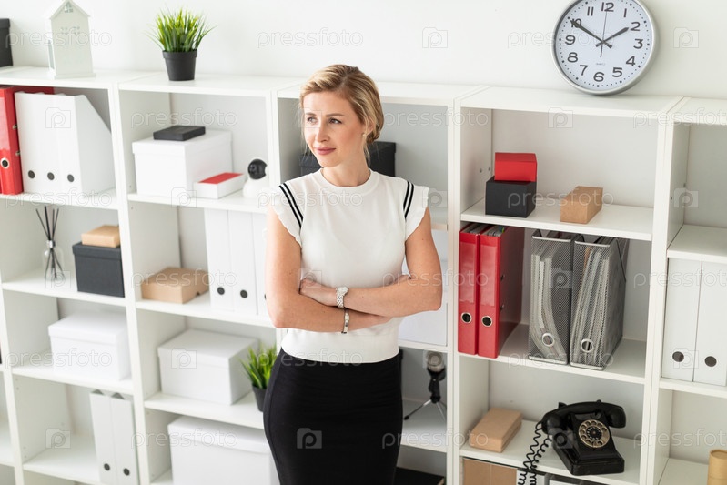 Красивая молодая девушка со светлыми волосами в белой рубашке работает в офисе. фото с глубиной резкости