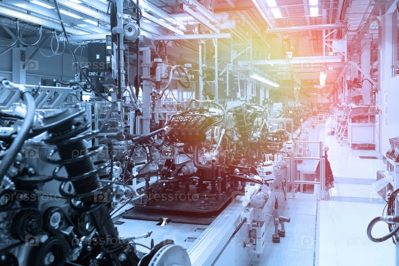 Сборка внутренней механики автомобиля. Линия по производству автомобилей. Синий тон. Синий оттенок
