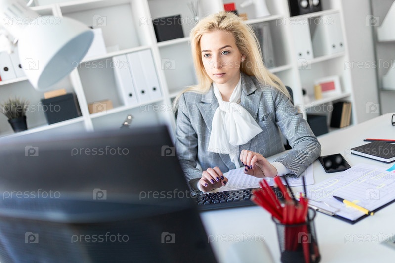 Стройная молодая девушка в белой блузке, серой куртке и темных брюках работает в офисе. У девушки белые длинные волосы. фото с глубиной резкости
