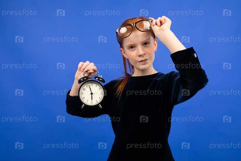 Серьезная рыжеволосая девушка-подросток в очках в черном платье вспоминает о пунктуальности, держащей будильник на синем фоне