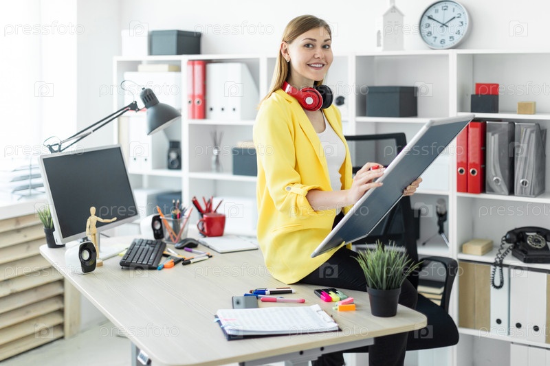 Молодая девушка сидит на столе и держит в руках маркер и магнитную доску. На шее у девушки висят наушники