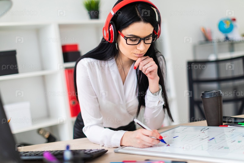 В офисе работает молодая девушка в очках, в белой блузке и черных брюках. У девушки длинные прямые черные волосы. фото с глубиной резкости