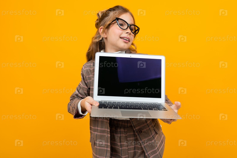 Девушка в классической куртке держит ноутбук экраном вперед с макетом