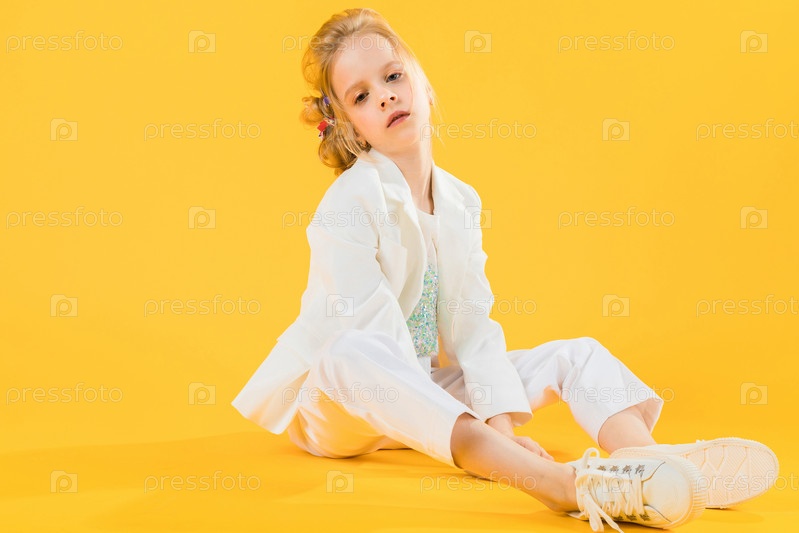 Портрет девочки-подростка в белом костюме и белой футболке с сердечком