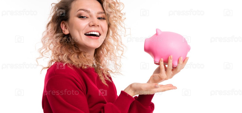 Европейская кудрявая девушка держит в руках копилку на белом фоне