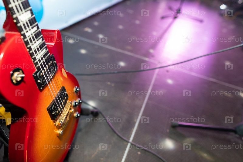 Бургундская гитара стоит на полу. Крупный план музыкального инструмента
