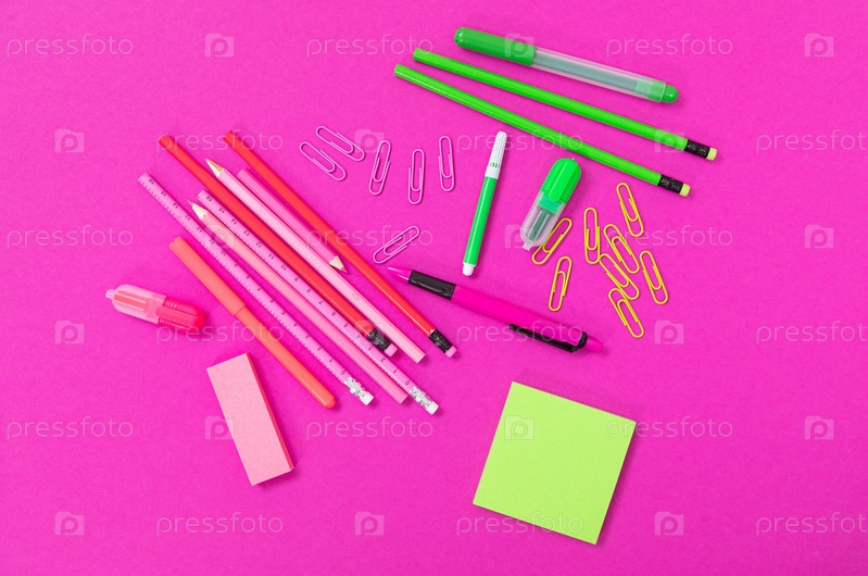 Группа канцелярских принадлежностей розового и ярко-зеленого цветов на розовой поверхности изолирована