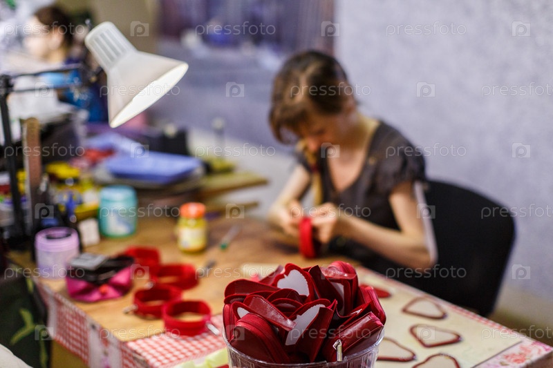 Шатенка шьет под лампой красные кошельки в форме сердечек. кошельки находятся в центре внимания. размытый фон