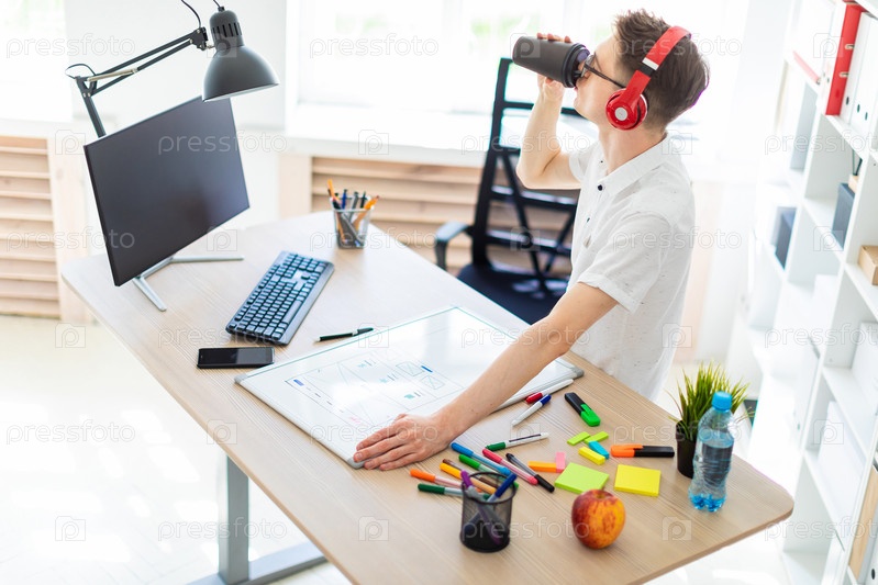 Молодой человек в белой рубашке и светлых джинсах работает в светлом офисе. фото с глубиной резкости