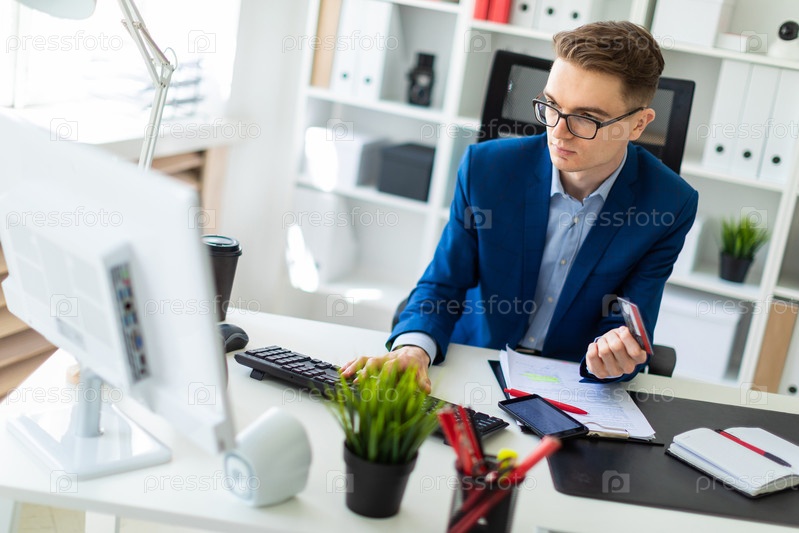 Случайный бизнесмен, работающий в офисе, сидящий за столом, печатающий на клавиатуре, смотрящий на экран компьютера