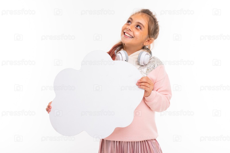 Маленькая красивая девушка с каштановыми волосами держит белую карточку и улыбается на белом фоне