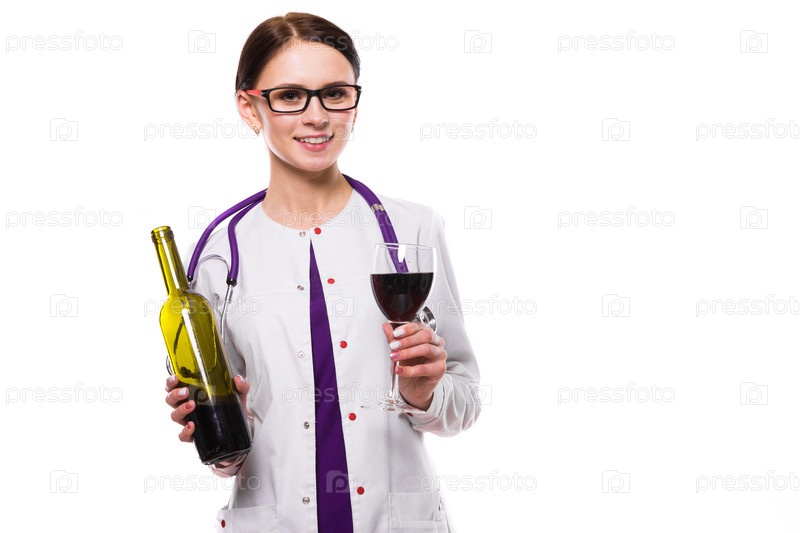 Молодая красивая женщина-врач со стетоскопом предлагает вино в белой форме на белом фоне