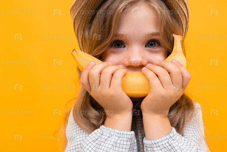 Милый ребенок держит банан вместо улыбки, фото красивой маленькой девочки