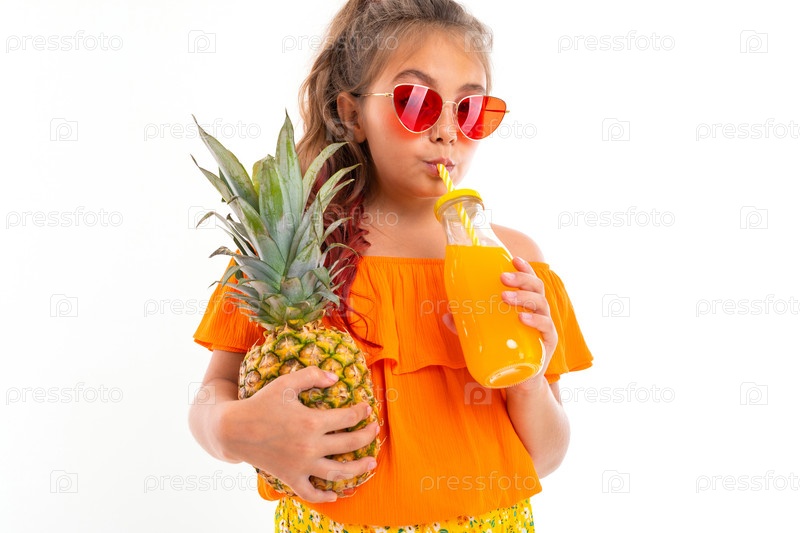 Изображение кавказской девушки в солнечных очках и телефоне пьет сок и держит ананас, изолированное на белом фоне