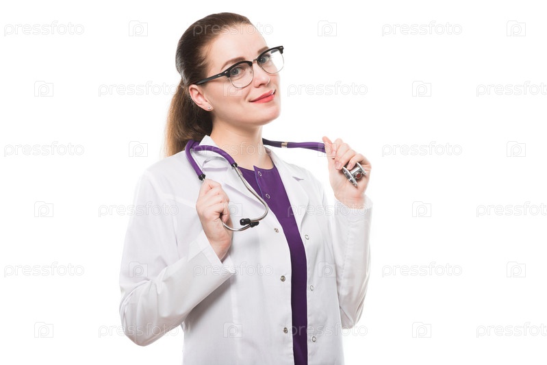 Красивая счастливая жизнерадостная женщина-врач смотрит в камеру и ждет пациента, уверенно улыбающегося со стетоскопом