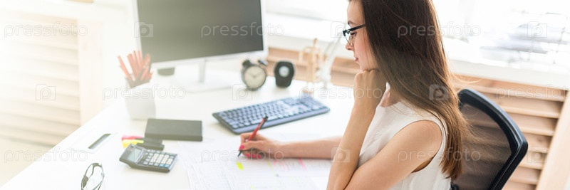Красивая молодая девушка сидит за столом в офисе, держит в руке ручку и заполняет документы