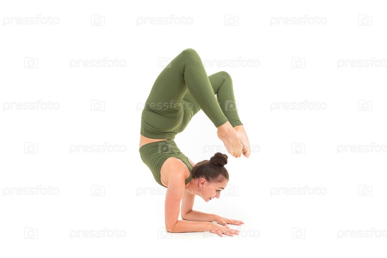 Красивая гибкая женщина, занимающаяся йогой на белом фоне
