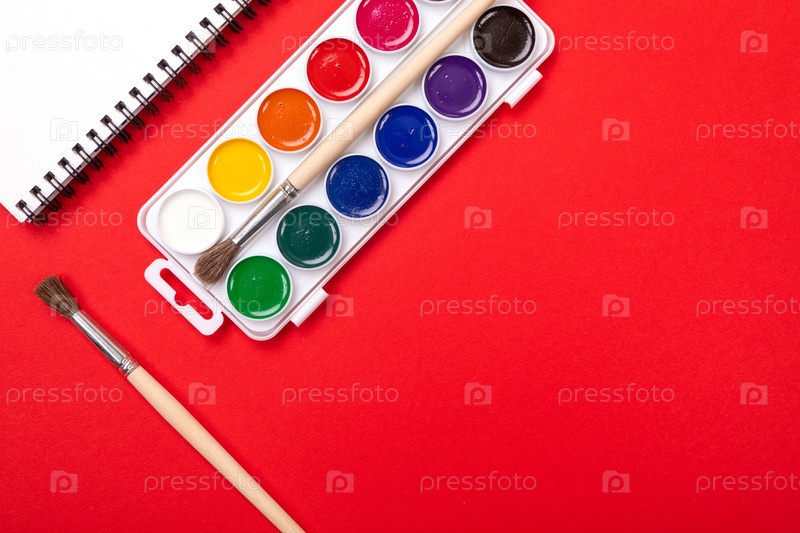 Акварельные краски и кисти с холстом для рисования с копирайтом на красном фоне