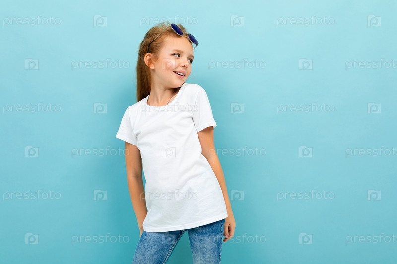 Харизматичная жизнерадостная девушка позирует в белой футболке на голубом фоне