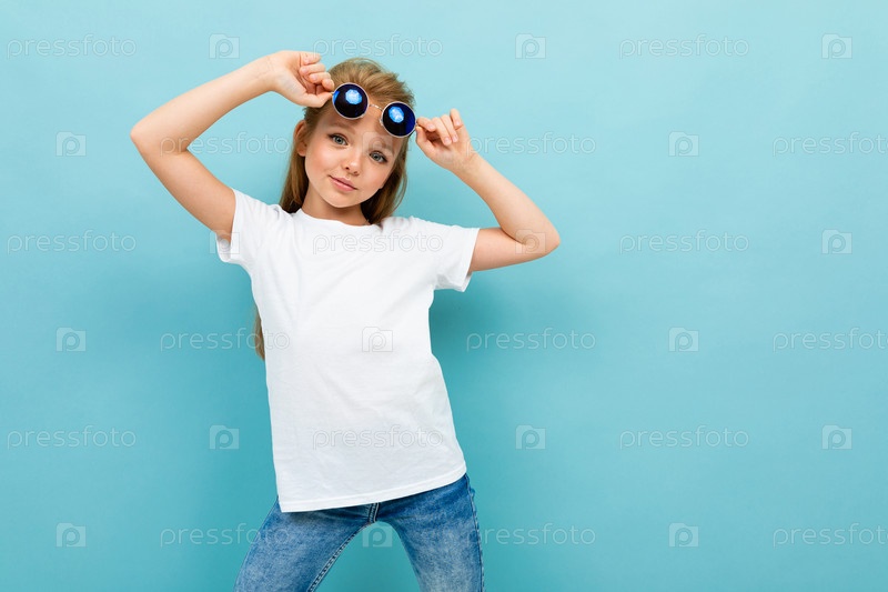 Модная красивая школьница в белой рубашке на синем фоне позирует