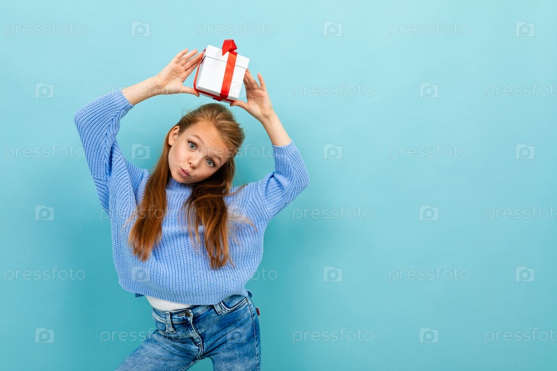 Маленькая кавказская девочка держит белую коробку с подарком под головой и испытывает много эмоций на синем фоне
