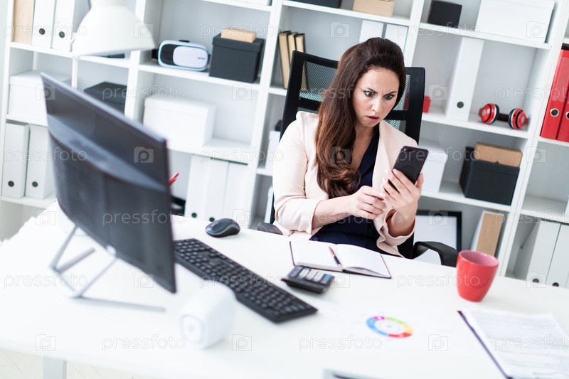 Молодая девушка сидит за столом в офисе, смотрит на экран телефона и пугается