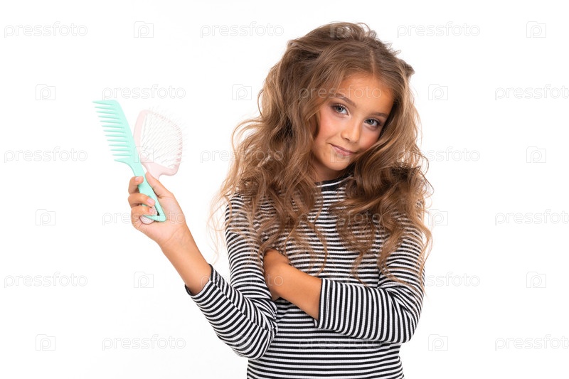 Милая девушка с макияжем держит в руках расчески на белом фоне