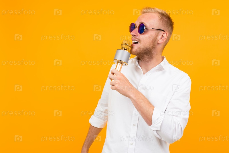 Портрет европейца в белой рубашке с микрофоном на желтом фоне