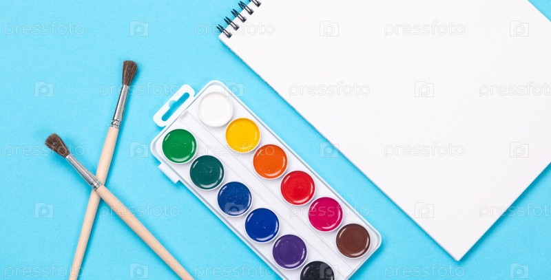 Набор акварельных красок с кистями и альбомом для рисования на синем фоне