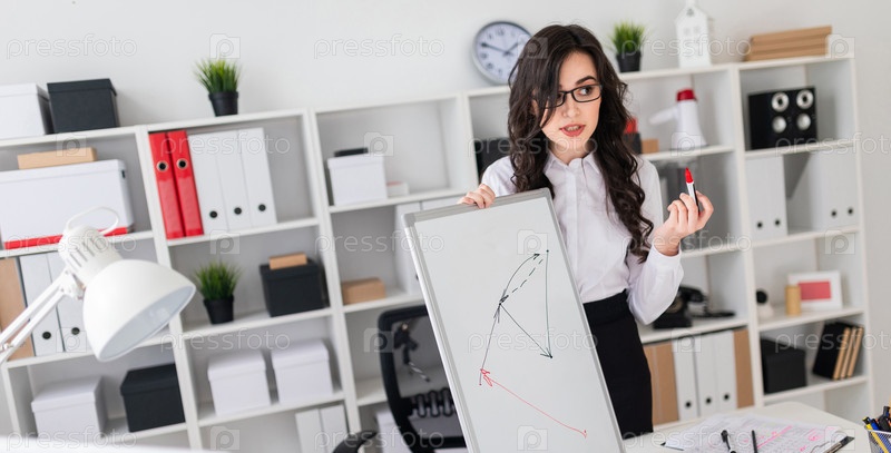 Красивая молодая девушка стоит возле офисного стола и рисует магнитным маркером на магнитной доске