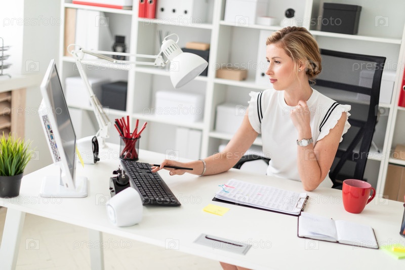 Молодая блондинка сидит за компьютерным столом в офисе, держит в руке карандаш и печатает на клавиатуре