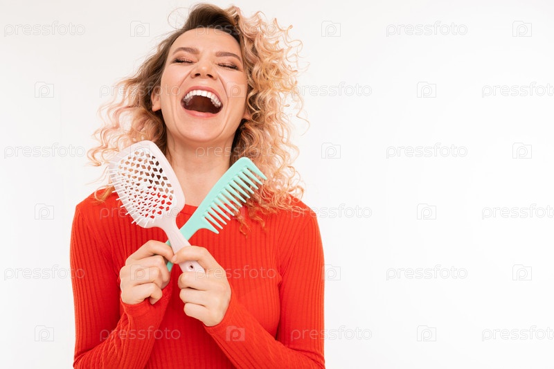 Кудрявая блондинка держит в руках расчески на белом фоне с копирайтом