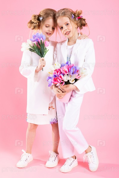 Девочки-близнецы в легкой одежде с букетами цветов стоят на розовом фоне