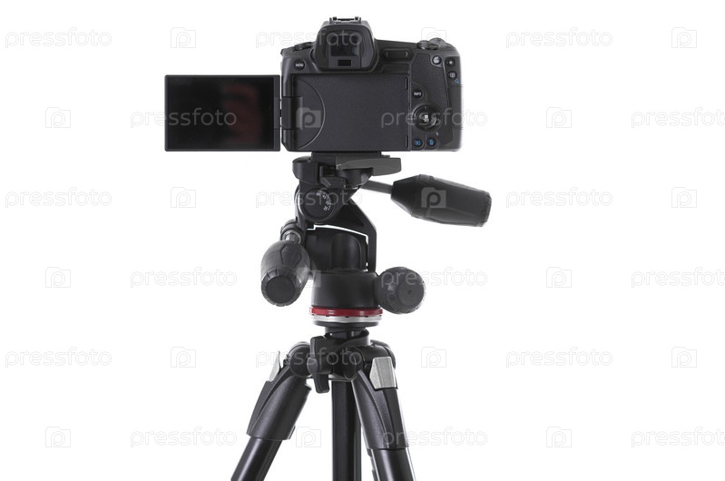 Вид сзади современной многофункциональной черной камеры на изолированном держателе