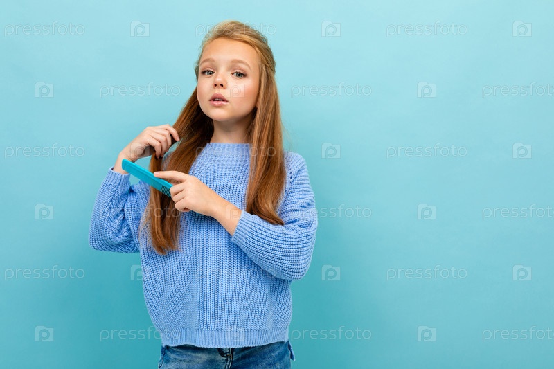 Милая европейская девушка расчесывает волосы на голубом фоне с копирайтом