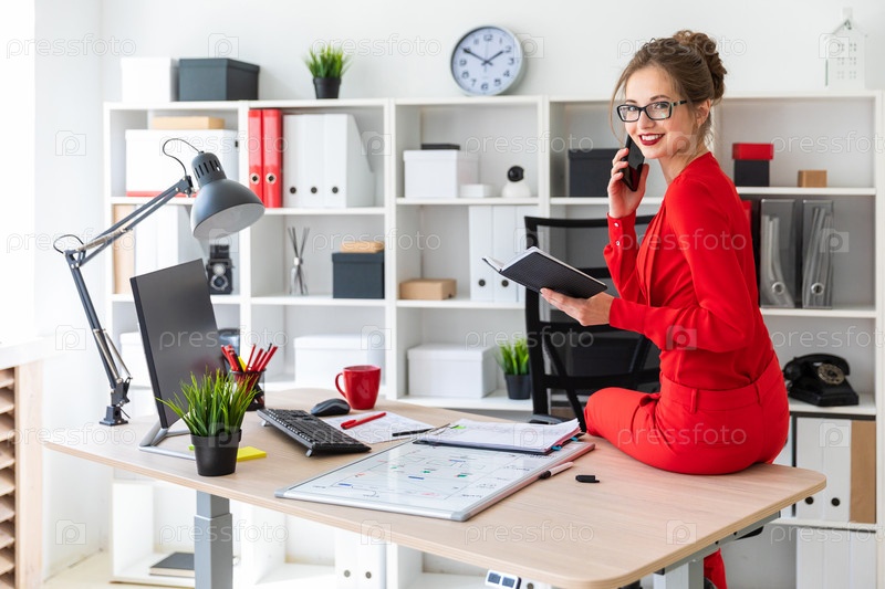 Молодая девушка села на стол в своем кабинете, держала в руках блокнот и разговаривала по телефону