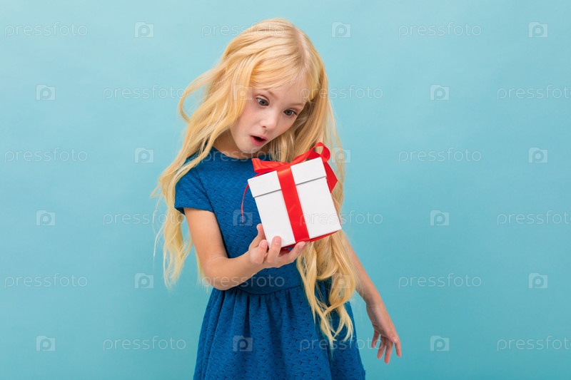Красивая кавказская девушка держит белую коробку с подарком и имеет много эмоций на синем фоне