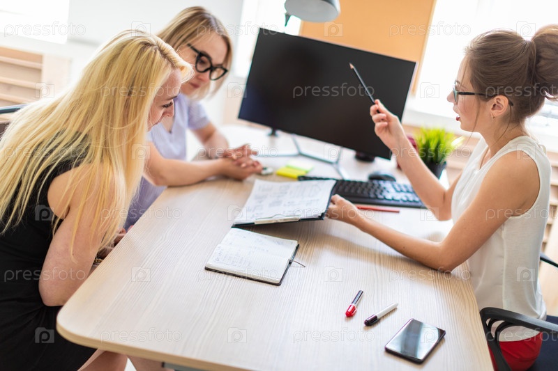 Молодая девушка сидит за столом в своем кабинете и разговаривает с двумя коллегами. Девушка держит карандаш в руке и указывает на них