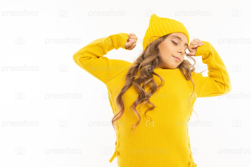 Европейская милая девушка в желтой одежде просыпается и растягивается на белом фоне с копирайтом