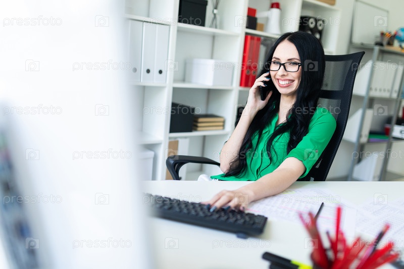 Улыбающаяся молодая девушка в очках в офисе говорит по телефону и держит руку на клавиатуре