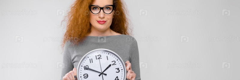 Портрет красивой рыжеволосой серьезной дружелюбной молодой женщины в серой одежде в очках, держащей часы в руках на сером фоне