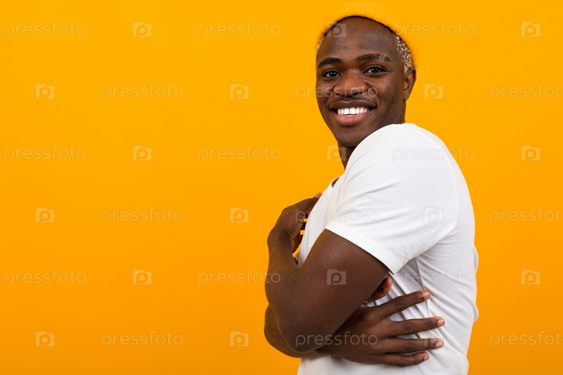 Красивый улыбающийся африканец в белой футболке обнимает себя и стоит боком на желтом фоне с копией пространства
