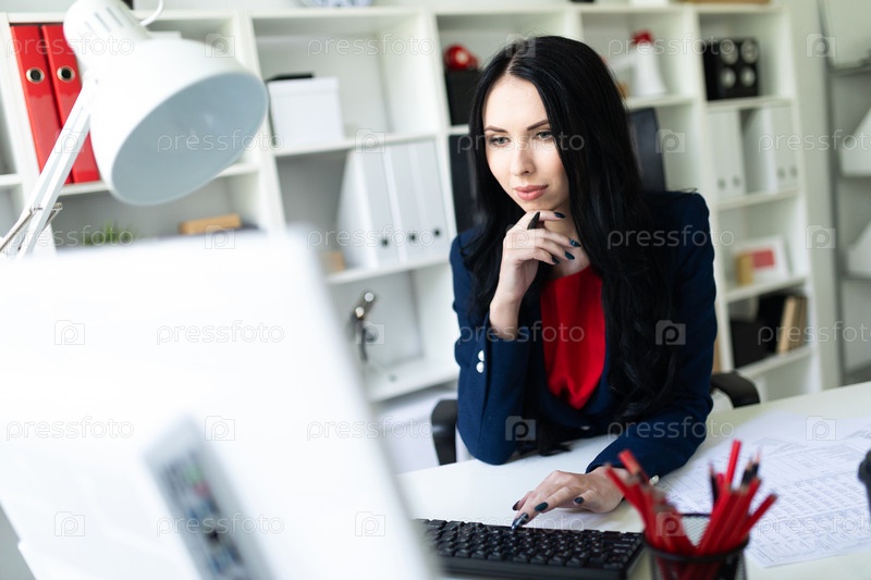 Красивая молодая девушка, работающая с компьютером и документами в офисе за столом