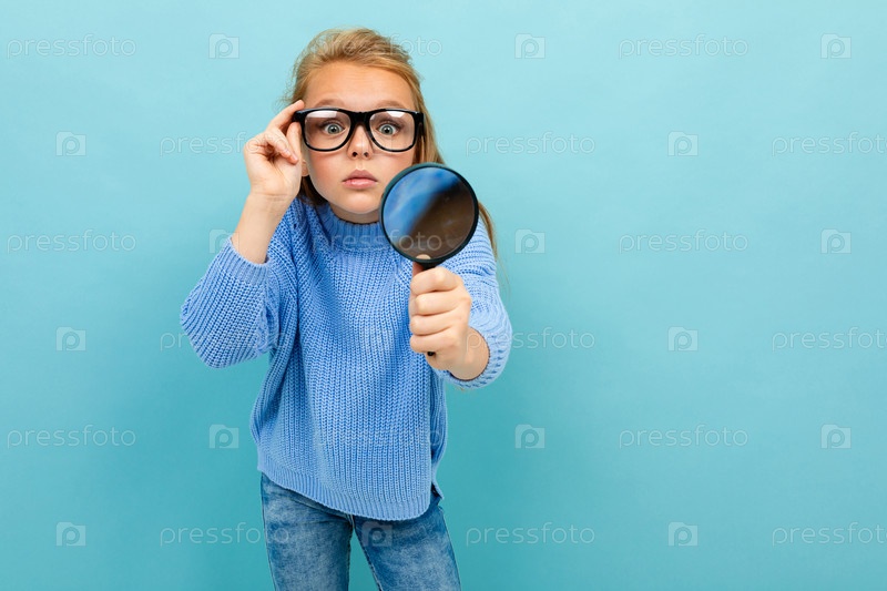 Слабовидящий ребенок на синем фоне