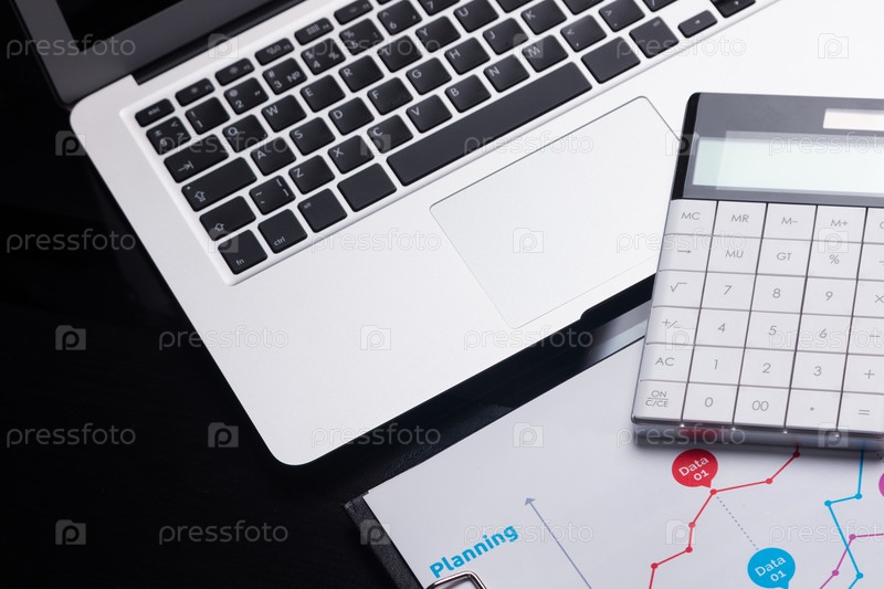 Современный калькулятор на ноутбуке и на листе с диаграммой