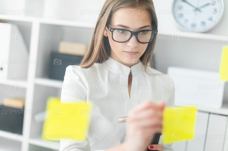 Молодая девушка стоит возле доски с наклейками в офисе. В руках у девушки стакан кофе